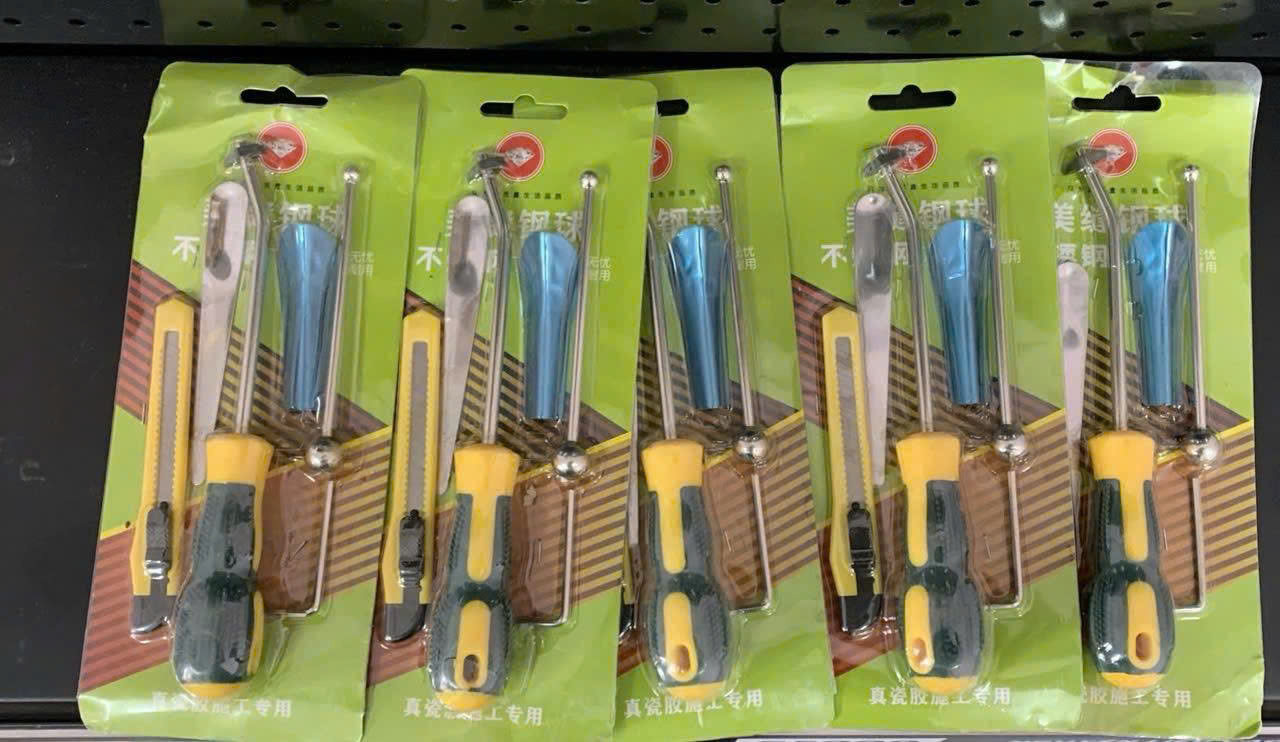 1 vít cạo ron ( vít vệ sinh bụi bẩn) ; 1 bi cầu miết ron; 1 dụng cụ miết ron; 1 dạo cậy ron