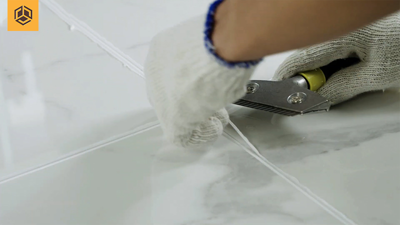 Sau khi hoàn thành bước miết ron, chờ từ 2-3h để keo khô hoàn toàn sau đó dùng tay hoặc dao sủi keo để loại bỏ phần keo thừa hai bên mép ron.