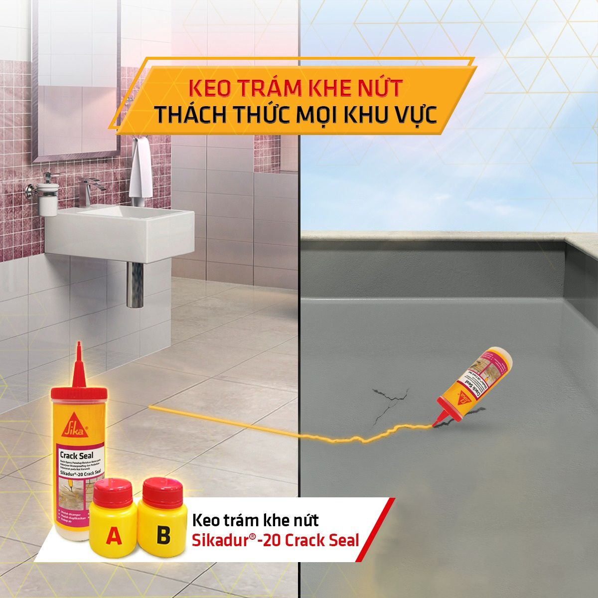 - Dùng để trám khe nứt nông và các lỗ rỗng trong cấu kiện bê tông như sàn, ban công, mái bê tông, khu vực ẩm ướt, hồ bơi, áp dụng trước công tác chống thấm.