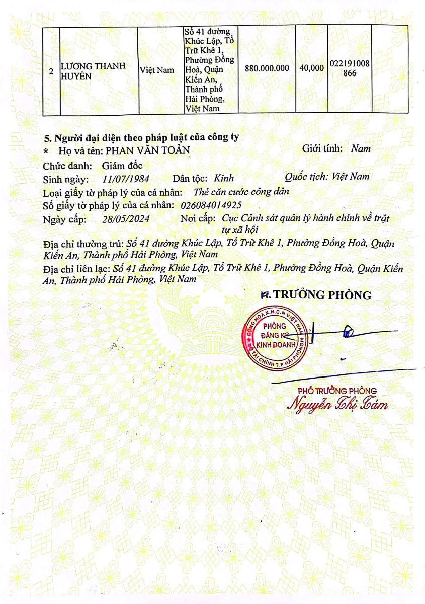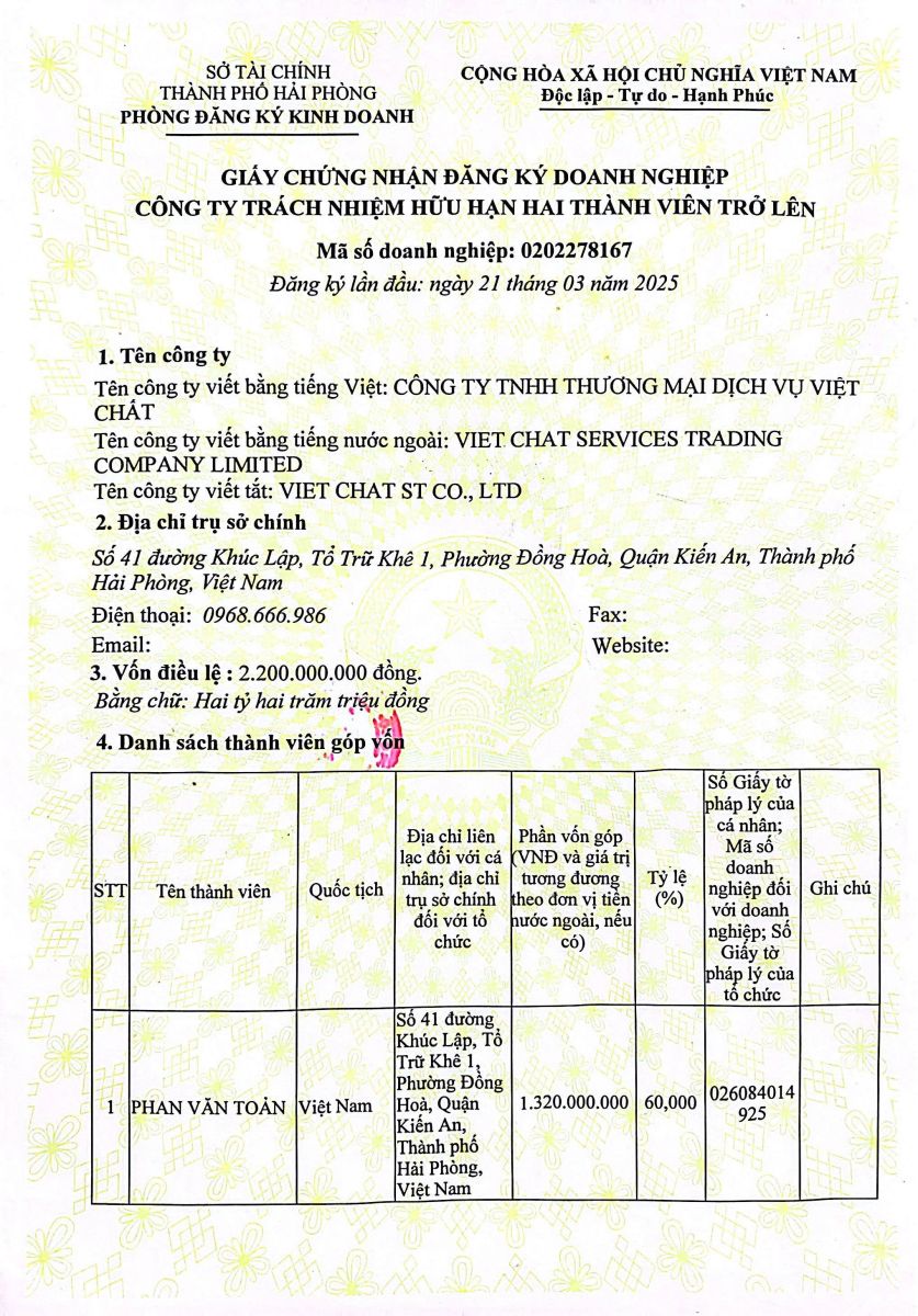Nơi cấp giấy chứng nhận đăng ký kinh doanh: Phòng đăng ký kinh doanh Sở Tài chính Thành phố Hải Phòng.