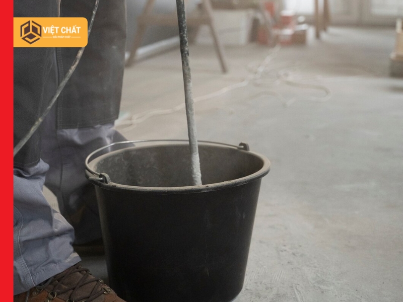 Bước 2: Từ từ cho keo dán gạch vào xô theo tỷ lệ 1 nước : 3 keo (tương đương 1 lít nước cho 4 kg keo).